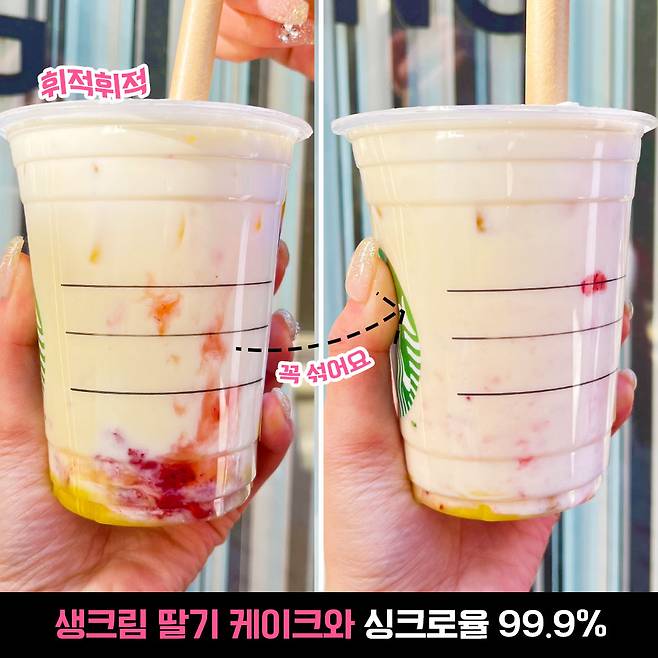 그런데 섞은 후 먹으니 정말 색다른 맛이 나더라구요! 진짜 딸기 케이크를 한 입 먹는 듯한 착각이 들 정도로 비슷했어요. 기본적으로 연유 향이 강하게 났고, 일반 딸기 라떼에 크림을 섞어서 그런지 조금 더 묵직하고 부드러운 질감이랍니다!