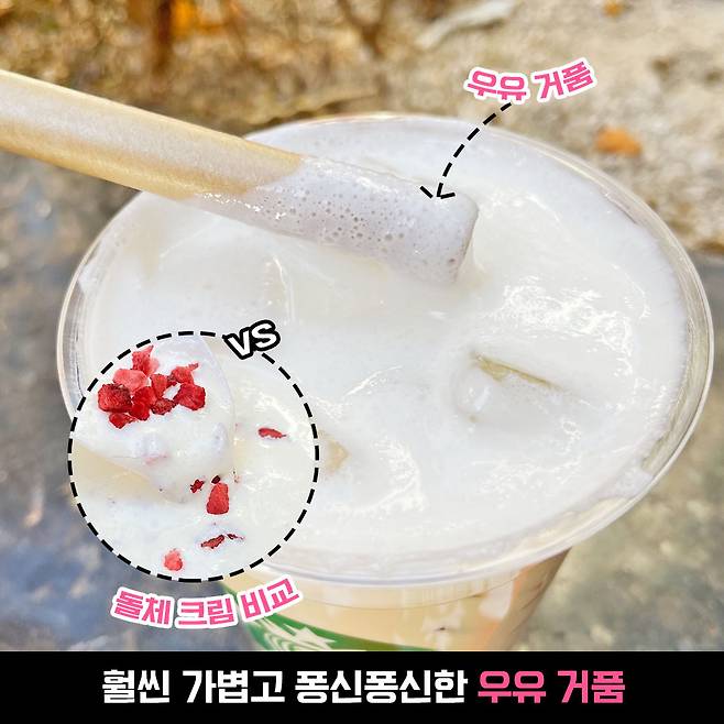 섞지 않고 한입 쪼로록 먹어봤어요. 우리가 흔히 이제 섞으려고 하는데 잘 섞이지는 않더라구요! 아마 음료와 거품의 질감도 다르고, 거품이 가벼워서? 그런 듯 해요.