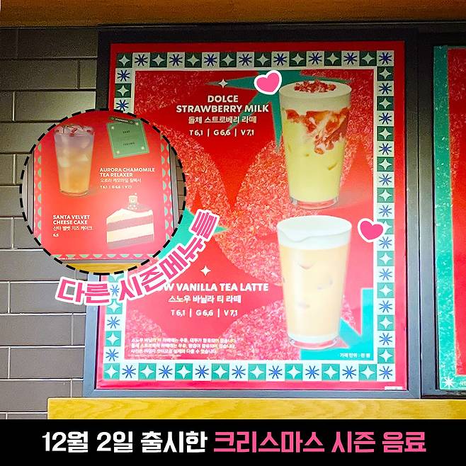 스타벅스 매장에 들어서니 벌써부터 크리스마스가 다가오는 것이 성큼 느껴져요. 먼저 가장 눈에 띄는 건 메뉴판 디자인이 성탄절에 맞게 바뀌었더라구요ㅇ_ㅇ! 또한 스타벅스 MD도 크리스마스 시즌을 맞아 빨강 초록으로 알록달록하게 출시되었어요.