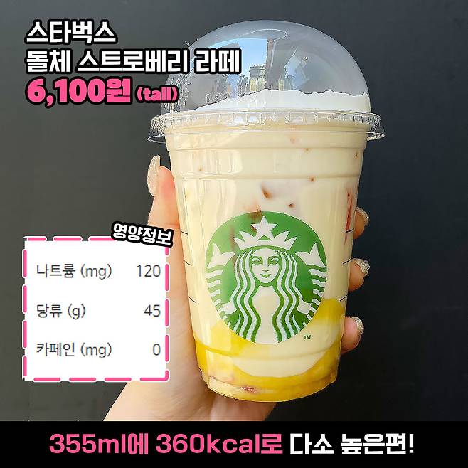 마찬가지로 밥심은 이번에도 TALL사이즈로 주문 완료! 스노우 바닐라 티 라떼는 355ml에 295kcal로, 방금 소개해드린 돌체 스트로베리 라떼보다는 적은 칼로리에요.