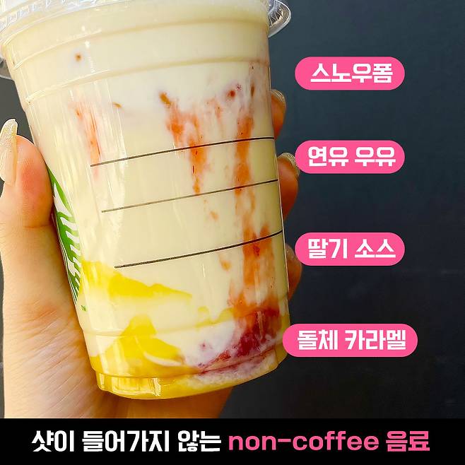 섞지 않았을 때는 맛이 따로따로 놀아 본연의 맛을 느낄 수 없으니 꼭! 완벽하게 섞고 드시길 추천해요. 밥심이 섞지 않고 먹어봤는데, 밑에 시럽은 어질할 정도로 달달하고 @_@ 우리가 아는 우유에 연유 섞은 맛뿐.