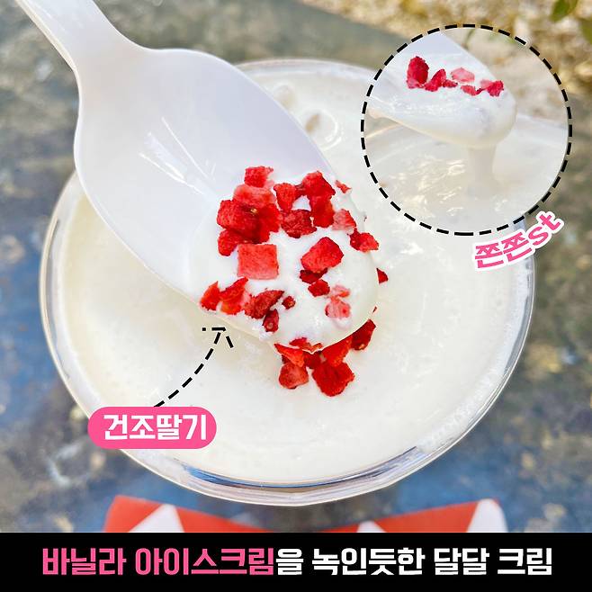 먼저 크림을 가볍게 떠봤는데 마치 생크림이 녹은 것 같이 쫀쫀해요. 숟가락으로만 떠도 부드럽고 묵직함이 느껴졌어요. 한입 먹어봤는데 달달보다는 달콤하다는 말이 어울리는 크림! 바닐라 향과 딸기의 향도 은은하게 나는게.. 크림부터 기대 이상인데요?