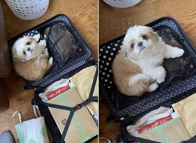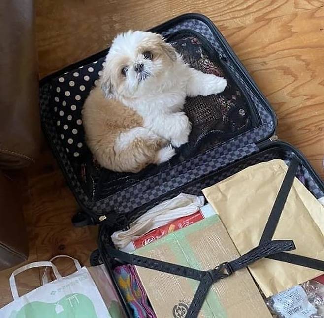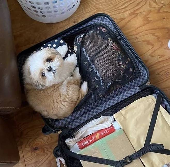 공개된 사진 속 강아지는 자기 자리라도 되는 줄 아는지 활짝 펼쳐져 있는 캐리어 가방에서 나올 생각을 하지 않는 모습이었죠.