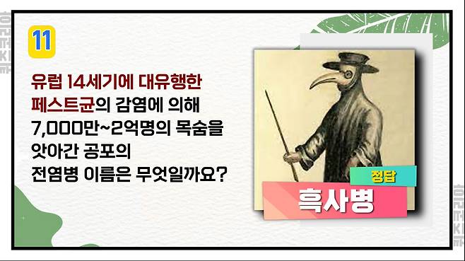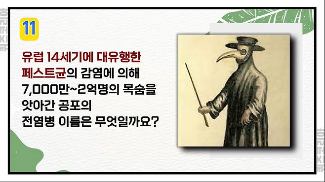 유럽 14세기에 대유행한 페스트균의 감염에 의해 7,000만~2억 명의 목숨을 앗아간 공포의 전염병 이름은 무엇일까요?