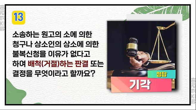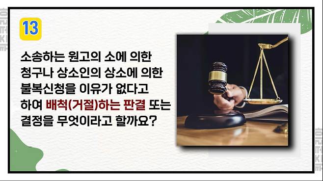 소송하는 원고의 소에 의한 청구나 상소인의 상소에 의한 불복신청을 이유가 없다고 하여 배척(거절)하는 판결 또는 결정을 무엇이라고 할까요?