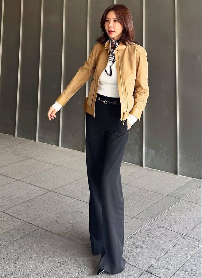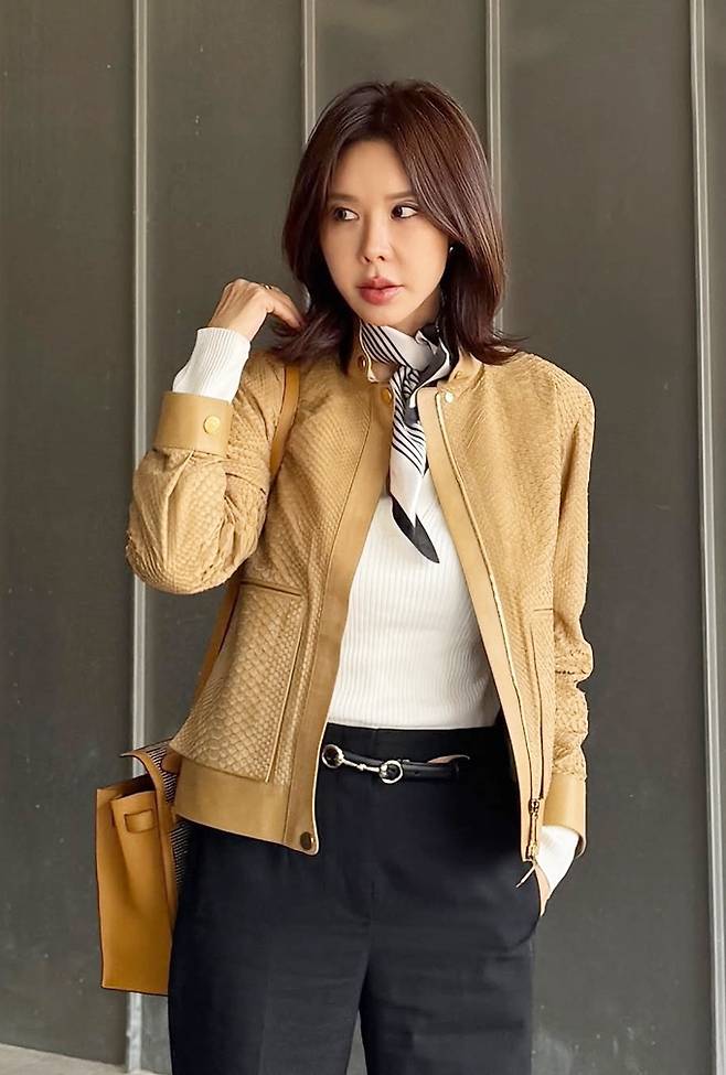 방송인 겸 사업가 김준희가 블루종 스웨이드 재킷룩으로 파워풀한 스타일을 선보였다.