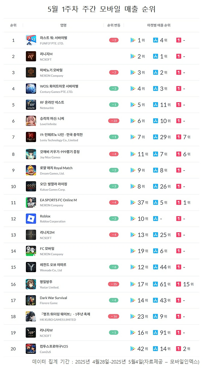 '마비노기 모바일'은 지난 4월28일부터 5월4일까지의 데이터를 집계해 산출된 5월 1주차 모바일 매출 순위에서 지난주(5위)보다 두 계단 상승한 3위를 기록했다. 집계 기간 애플 앱스토어 1위를 달성하고, 구글 플레이에서도 3위에 오르는 등 강세를 보였다.