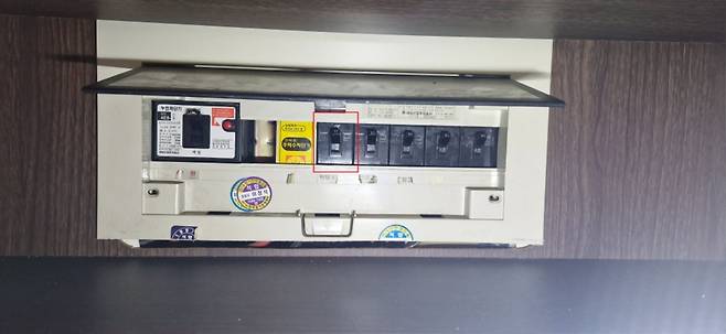 두번째의 누전차단기에 빨간색으로 박스쳐진 첫번째 스위치에 집안 전체의 전등의 전기가 연결되어 있습니다. 현재 다른 등은 전부 정상작동을 하고 있습니다. 메인 누전 차단기는 테스트 버튼을 눌러봐서 누전차단기가 정상작동 하는 것은 확인을 했습니다. 또한 3일간 계량계 확인을 통해서 본 결과 유의할 만한 전력 사용량의 증가는 없는 듯 합니다. (24시간 기준 10kw 이하)