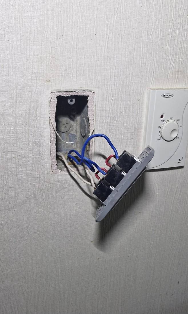 며칠 전 30년 된 구축 빌라의 전등 스위치들을 전부 교체했습니다. 그 중 첫 사진의 위에 보이는 거실등의 스위치가 교체 후에는 정상작동을 하다가 다음날 되니 작동을 하지 않습니다. (스위치는 빨간 박스 안에 있는 것입니다.)