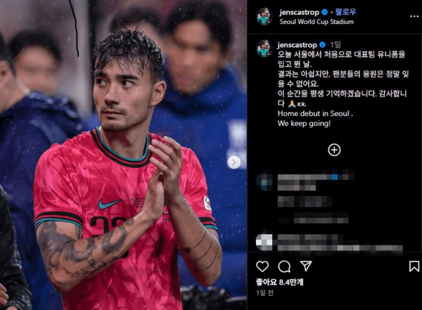 그는 "오늘 서울에서 처음으로 대표팀 유니폼을 입고 뛴 날. 결과는 아쉽지만 팬들의 응원은 정말 잊을 수 없어요. 이 순간을 평생 기억하겠습니다. 감사합니다"라고 한글로 전했다. 이어 "Home debut in Seoul. We keep going!(서울에서의 홈 데뷔전. 우리는 계속 나아간다!)"라는 문장으로 각오를 덧붙였다.
