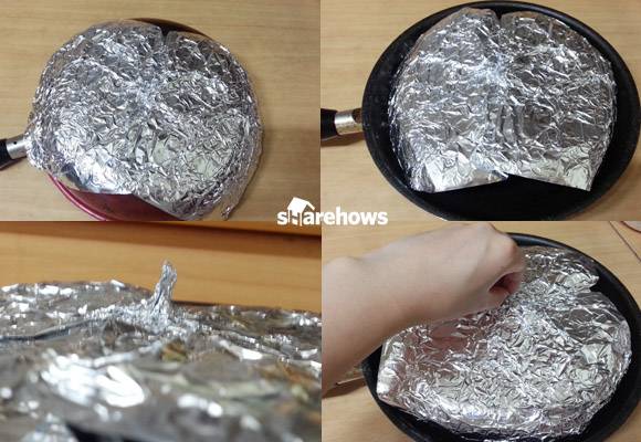 뚜껑 없이 요리를 하다 보면 음식물이 바닥이나 가스레인지에 튀기도 하고 이물질이 들어가 위생상 좋지 않은데요. 쿠킹 호일을 살짝만 구부리고 잡아주면 간단하게 뚜껑을 만들 수 있어요. 우선 프라이팬을 뒤집은 다음 넉넉하게 쿠킹 호일을 대주세요. 그리고 쿠킹 호일의 가운데 부분을 살짝 꼬집어서 돌돌 말면 손잡이가 됩니다.