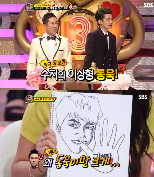당시 MC는 신동엽과 이동욱이었는데요. 수지는 3주년 기념으로 MC들에게 자신이 직접 그린 캐리커쳐를 선물로 줬습니다. 특히 이동욱의 그림만 따로 크게 그려 다른 MC 들의 질투를 자아냈습니다.