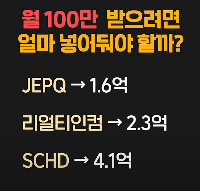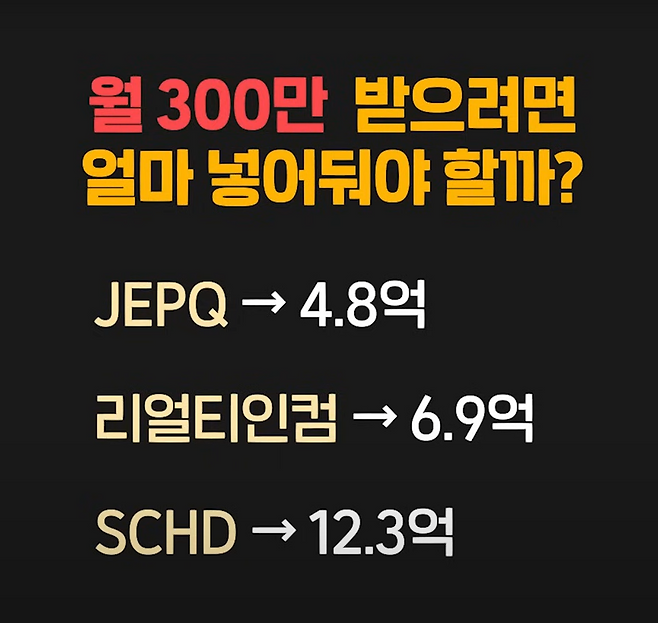월에 배당금 300만 원을 받기 위한 투자 금액은 미국 상장 ETF 중 인기 있는 종목에 투자한다고 가정했을 때 JEPI는 4억 8,000만 원, 리얼티 인컴은 6억 9,000만 원, SCHD는 12억 3000만 원이 필요합니다.