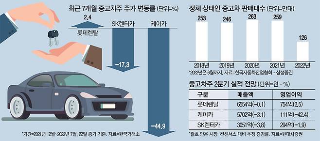 국내 중고차 관련주들의 올해 2분기 실적 전망도 마냥 밝지만은 않다. 롯데렌탈의 경우 2분기 영업이익이 컨센서스(시장 추정치)에 부합할 것으로 보이지만 케이카, SK렌터카는 각각 42.4%, 1.9% 하회할 것으로 전망됐다. 케이카는 어닝 쇼크 수준이다. 장문수 현대차증권 연구원은 "성장 기대 둔화와 실적이 부진한 업체의 경우 낮아지는 실적 추정치와 높은 밸류에이션 부담으로 주가 부진이 더욱 클 것으로 전망된다"고 말했다.
