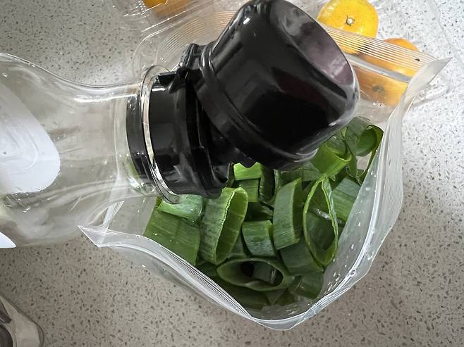 2. 지퍼백이나 밀폐용기에 대파를 담습니다.