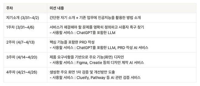 ํ๋ก๊ทธ๋จ์ 4์ฃผ๋ก ๊ตฌ์ฑ๋์ด ์๊ณ , ํ ์ฃผ์ ํ๋์ฉ ๋ค ๊ฐ์ง ์ฃผ์ ๋ฏธ์