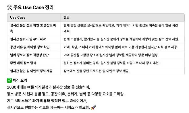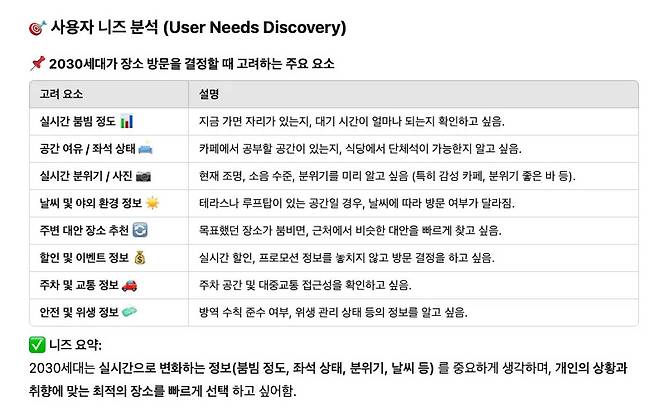 ์ฌ์ฉ์ ๋์ฆ ๋ถ์ (User Needs Discovery) (1) 2030์ธ๋๊ฐ ์ฅ์ ๋ฐฉ๋ฌธ์ ๊ฒฐ์ ํ ๋ ๊ณ ๋ คํ๋ ์์(์: ์ค์๊ฐ ๋ถ๋น ์ ๋, ๋ ์จ, ๊ณต๊ฐ ์ฌ์ )๋ฅผ ์ ๋ฆฌํด์ค. (2) ๊ตฌ์ฒด์ ์ธ ์ฌ์ฉ์ ์๋๋ฆฌ์ค๋ฅผ ์์ฑํ์ฌ, ์๋น์ค๊ฐ ํด๊ฒฐํด์ผ ํ๋ ์ฃผ์ Use Case๋ฅผ ์ค๋ช ํด์ค.