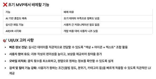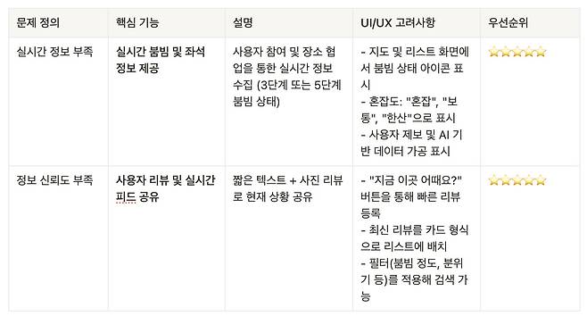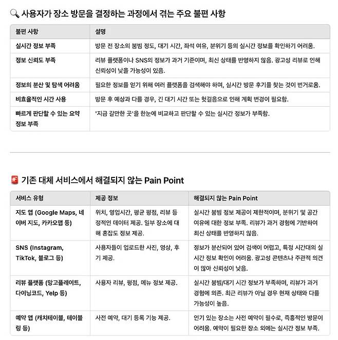 (1) ์ฌ์ฉ์๊ฐ ์ฅ์ ๋ฐฉ๋ฌธ์ ๊ฒฐ์ ํ๋ ๊ณผ์ ์์ ๊ฒช๋ ์ฃผ์ ๋ถํธ ์ฌํญ์ ๋ถ์ํด์ค. (2) ๊ธฐ์กด์ ์กด์ฌํ๋ ๋์ฒด ์๋น์ค(์: ์ง๋ ์ฑ, SNS, ๋ฆฌ๋ทฐ ํ๋ซํผ)์์ ํด๊ฒฐ๋์ง ์๋ Pain Point๋ฅผ ๋์ถํด์ค.