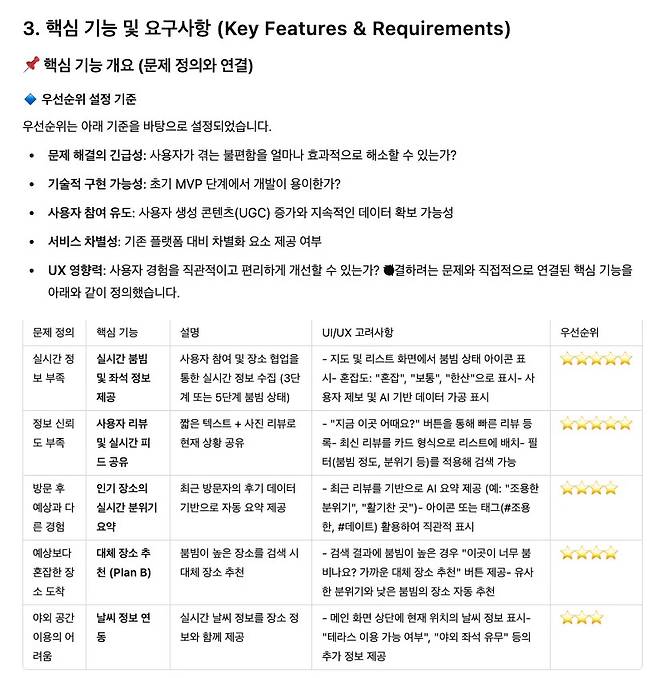 3.ํต์ฌ ๊ธฐ๋ฅ ๋ฐ ์๊ตฌ์ฌํญ (Key Features & Requirements): ์ ํ์ ์ฃผ์ ๊ธฐ๋ฅ, ํ์ ์๊ตฌ์ฌํญ, ๊ณ ๋ คํด์ผ ํ ๊ธฐ์ ์ ์์, ์ฐ์ ์์์ ์ ์ ๊ธฐ์ค