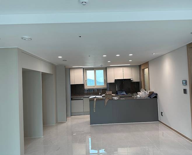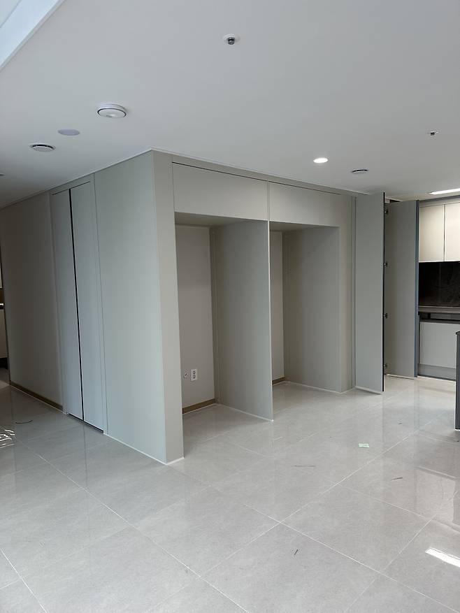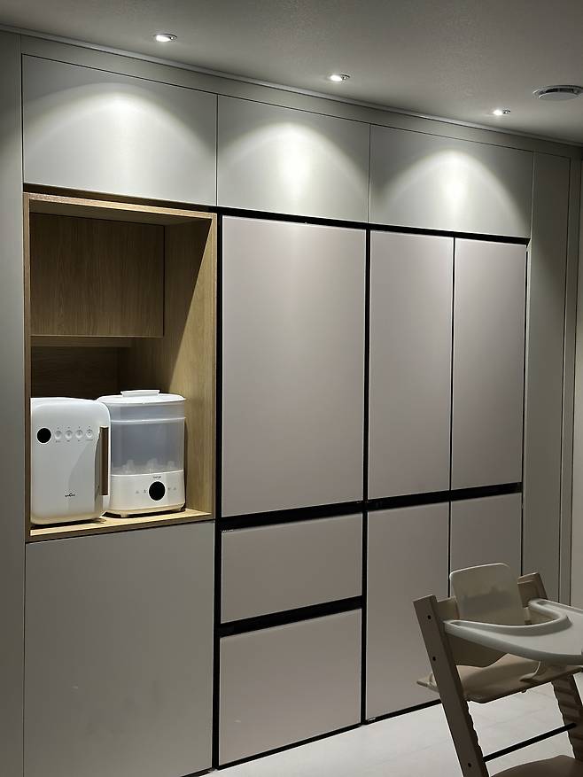 청약 당첨 후 새 집으로 사전 점검을 왔을 땐 기본 옵션으로 바닥 타일을 깔고 주방 확장을 했어요. 그 이후로 둘째가 생기는 바람에 시공 매트도 하고, 홈바가 만들고 싶어서 냉장고장도 다시 건드리고, 거실 조명부터 복도 조명까지 새로 시공했습니다. 더 큰 변화를 주고 싶지만 알파룸은 팬트리로 만들어버려서 가구를 놓을 공간이 부족하더라고요. 요즘엔 '최대한 미니멀로 지내보자'하고 쭈욱 살아가고 있습니다.