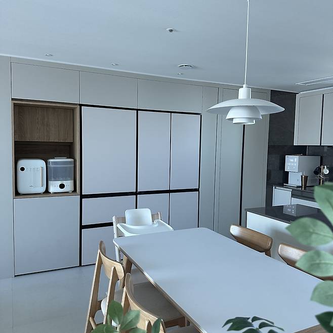 저희는 입주해서 살다가 어느 순간 인테리어에 보완이 필요할 것 같아 조명 시공을 알아보았어요. 그렇게 견적을 내던 중 한 업체는 정말 환 공포증을 일으킬 정도로 조명을 많이 달아야 한다고 말씀해 주시더라고요. 많은 조명을 추구하시는 분들도 계시겠지만 저는 깔끔한 모습을 원해서 '죄송합니다'하고 바로 다른 곳을 알아보게 되었습니다. 인테리어를 하다 보면 결정할 것이 정말 많은데, 그 모든 과정 후에 이렇게 멋진 모습을 얻게 되니 힘들었지만 참 뿌듯한 경험이었던 것 같아요.