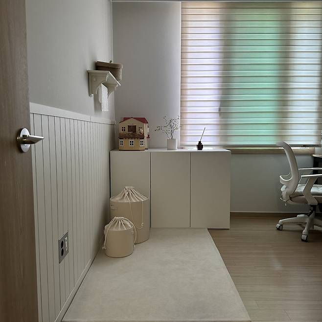 서재 방에는 루바를 설치했는데요. 이건 저희 신랑이 셀프 시공으로 만들어주었답니다. 처음엔 '나는 이런 거 잘해' 하고 파이팅 넘치게 열심히 하더라고요. 하지만 모두 마친 뒤, 다음날에 바로 앓아누워버렸습니다. 신랑의 땀과 눈물까지 함께 들어간 인테리어라서 그런지 정말 애정이 가요.