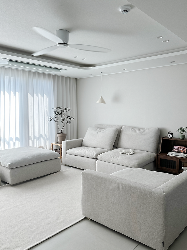 또 거실엔 우물천장과 무몰딩 라운드 시공을 하고, 실링팬을 달아주었는데요. 실링팬을 망설이고 계신 분들이 계시다면 꼭 하시라고 말씀드리고 싶어요. 공기 순환도 잘 되고, 여름에 에어컨과 같이 틀면 금방 시원해지기도 하거든요.