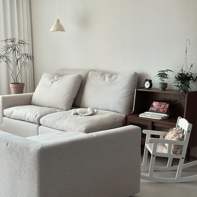 거실 소파는 정말 신중하게 골랐어요. '무조건 편안한 소파'를 찾던 중 까사미아의 캄포 소파가 그렇게나 편하다고 해서 바로 매장으로 달려가서 확인 후 바로 골라왔네요. 또 소파 배치는 약간 어렵기도 했는데요. 제일 기본적인 1자 구조로 놓고 쓰기엔 시시했고요. 그래서 이리저리 옮겨보다가 소파가 서로 마주 보고 가운데에 사각형 공간이 생기는 지금의 모습으로 완성했답니다. 앞으로는 어떤 변화를 줄지 벌써부터 고민 중이에요.