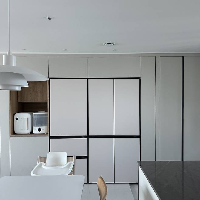 냉장고 위에는 매립등을 2인치 주백색으로 달아주었는데요. 볼 때마다 별이 총총 박혀있는 것 같아서 정말 예쁘답니다. 2인치로 시공한 게 신의 한 수였던 것 같아요!