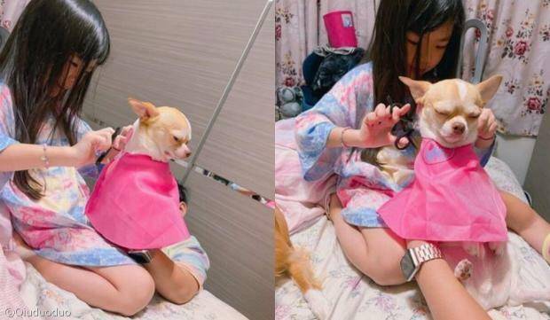 진짜 미용실이었으면 짖고 몸부림을 쳤을 텐데 녀석은 가만히 있었다. 불쾌하고 귀찮지만 꼬마 집사를 위해 참아주는 듯했다.