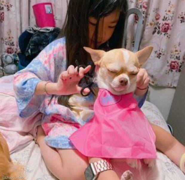치우두오두오에게 커트보를 해준 꼬마 집사는 장난감 가위를 들고 진지하게 녀석의 털을 잘랐다.