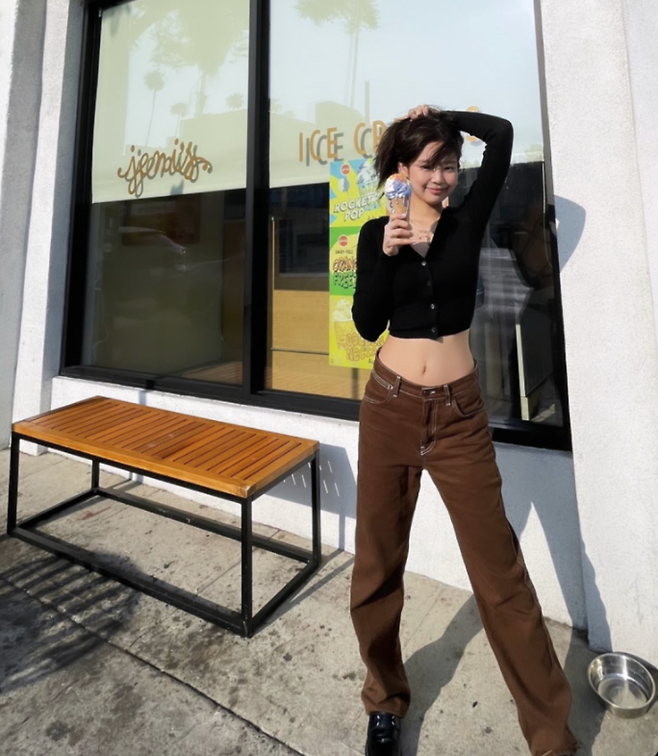 제니는 블랙 가디건에 브라운 청바지로 로우라이즈 핏을 선보이기도 했다.