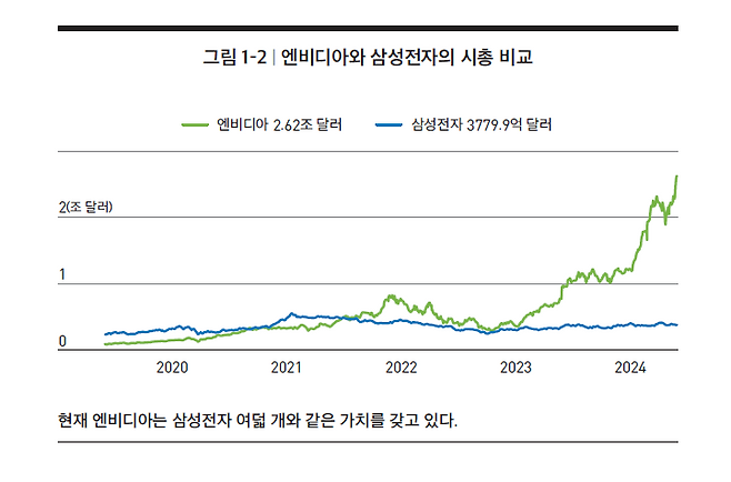 우리나라 코스피, 코스닥에 상장된 기업의 시가총액을 모두 합쳐도 엔비디아 한 회사의 시가총액에 미치지 못한다. 가전제품부터 휴대전화, 메모리 반도체까지 모두 직접 만드는 삼성전자 같은 회사가 여덟 개는 모여야 엔비디아와 같은 가치를 갖게 된다는 얘기다.