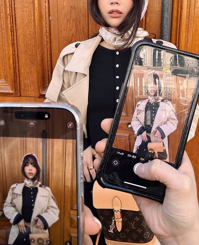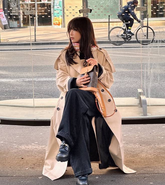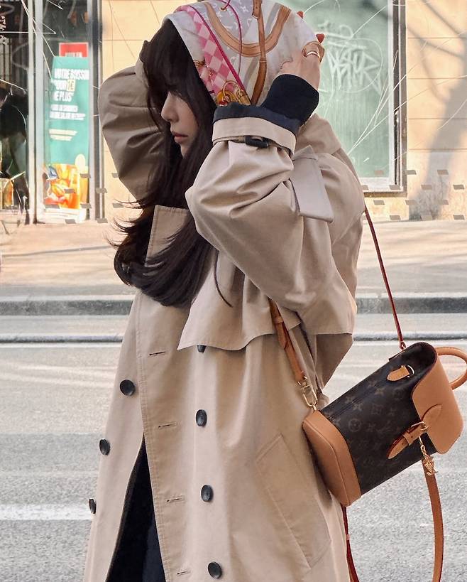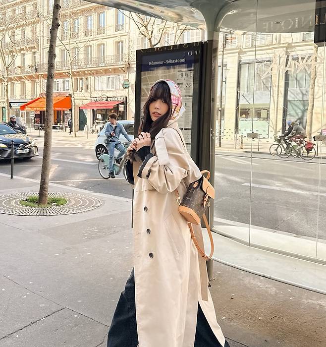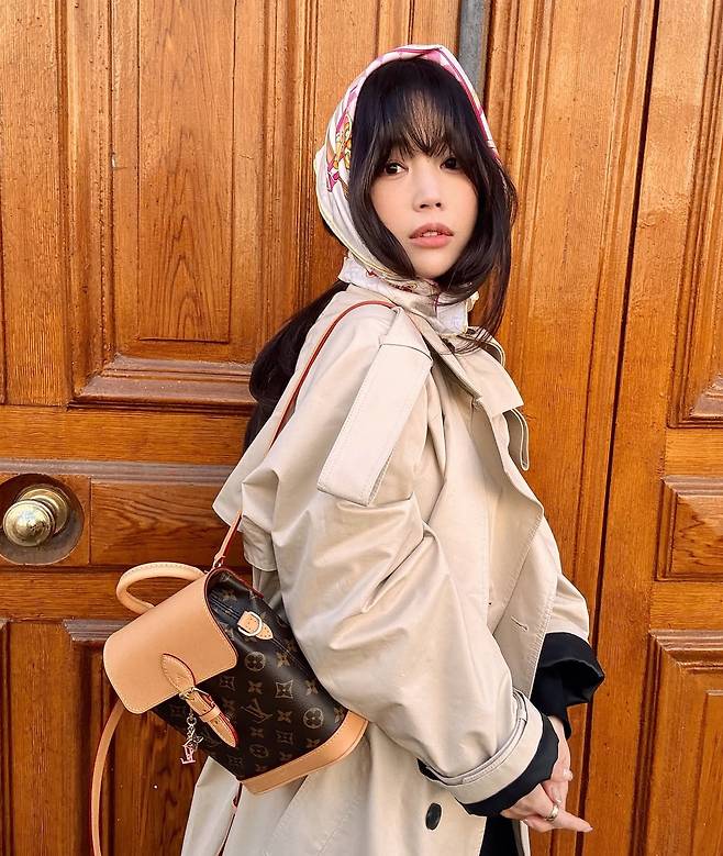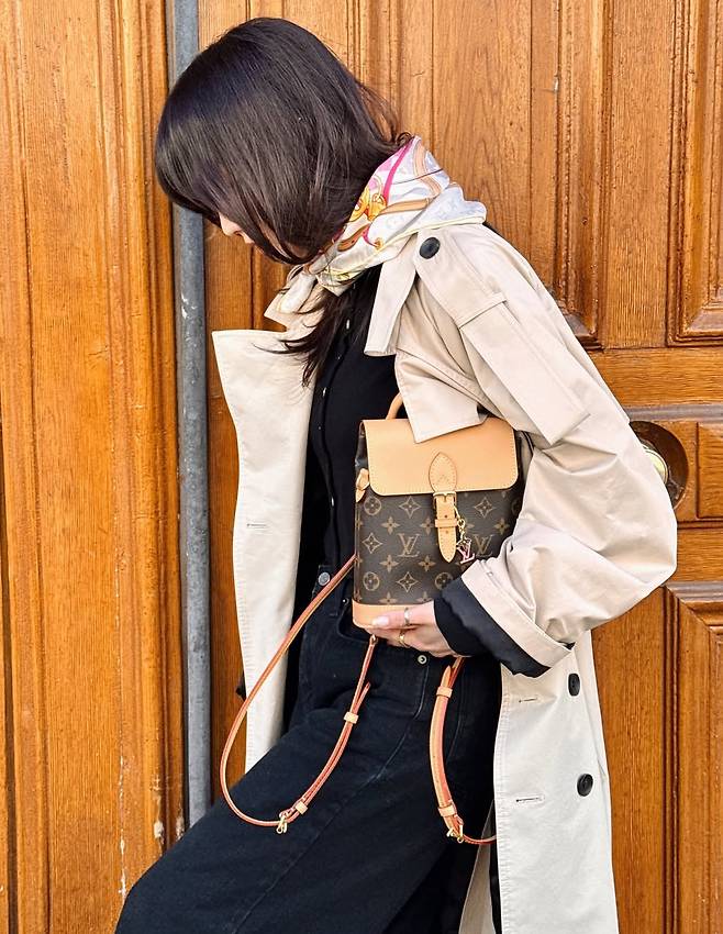 모노그램 패턴이 돋보이는 루이비통 백팩을 매치해주어서 더 예쁘네요