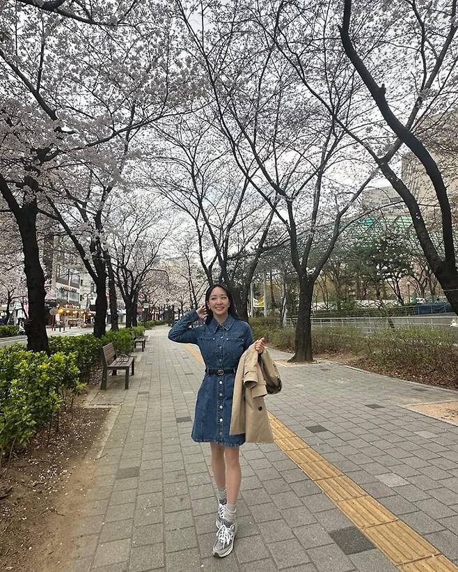 김선신은 인스타그램에 “주말 지나면 못 볼 벚꽃 안뇽 즐거웠어”라는 멘트와 함께 만개한 벚꽃 아래 찍은 사진을 공개했다. 사진 속 그녀는 데님 셔츠 원피스를 중심으로 캐주얼하면서도 단정한 분위기의 스타일링을 완성했다. 버튼 다운 디테일이 들어간 데님 원피스는 그녀의 단정한 이미지를 더욱 살려주며, 허리 벨트로 실루엣에 라인을 더해 여성스러움을 강조했다.