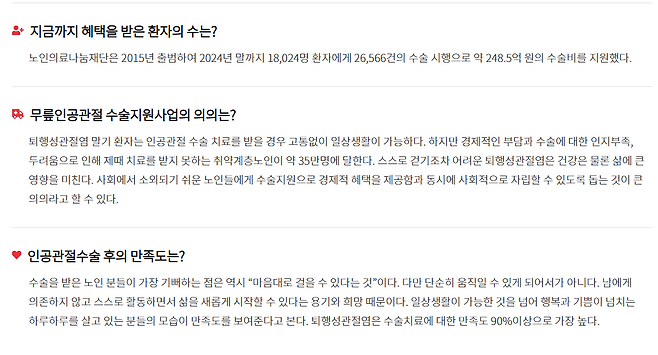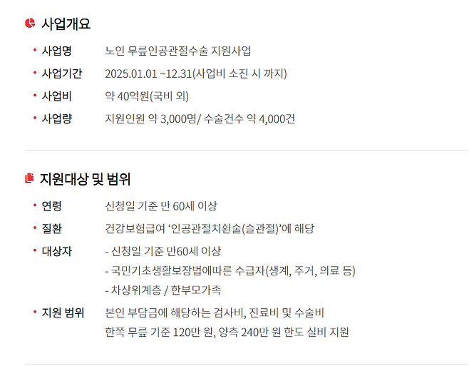 다행히 이런 경제적 부담을 덜어주는 제도가 있어요. 바로 ‘무릎인공관절 수술비 지원사업’인데요. 정부와 노인의료나눔재단이 협력해 경제적 여건이 어려운 분들을 위해 수술비를 일부 지원하는 제도랍니다. 이 제도 덕분에 더는 비용 때문에 아픈 무릎을 참고 지내지 않아도 되는 거예요.