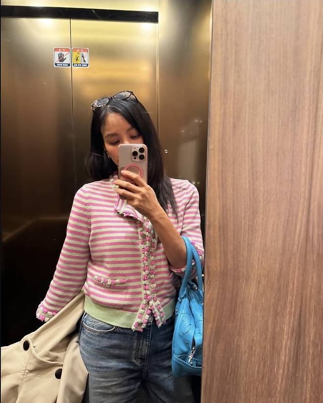 특히, 네이비 앤 화이트 배색 니트 집업을 활용한 클래식한 캐주얼 룩과 핑크 스트라이프 트위드 카디건에 청바지를 매치한 사랑스러운 스타일링은 세련된 감성을 극대화했습니다.