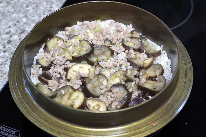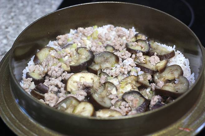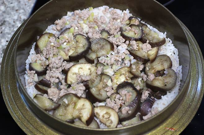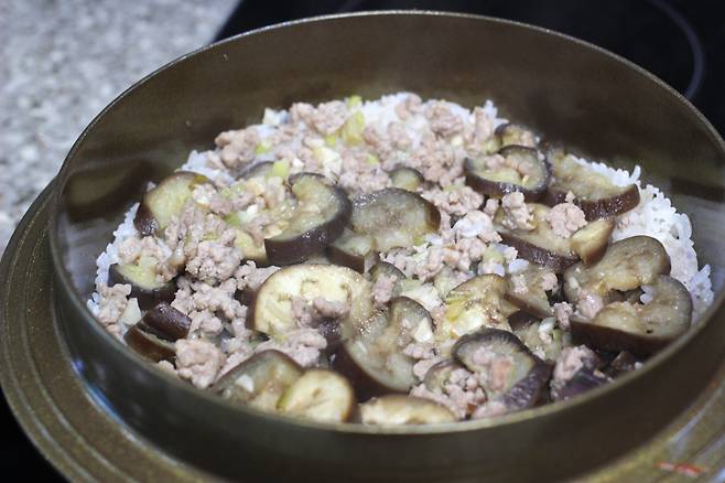 쌀 2컵, 가지 1~2개, 돼지고기 다짐육 100g, 대파