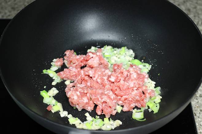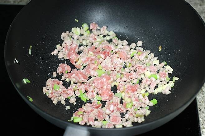 대파의 향이 올라오면 돼지고기를 넣고 볶아요.