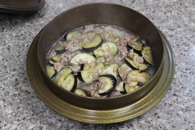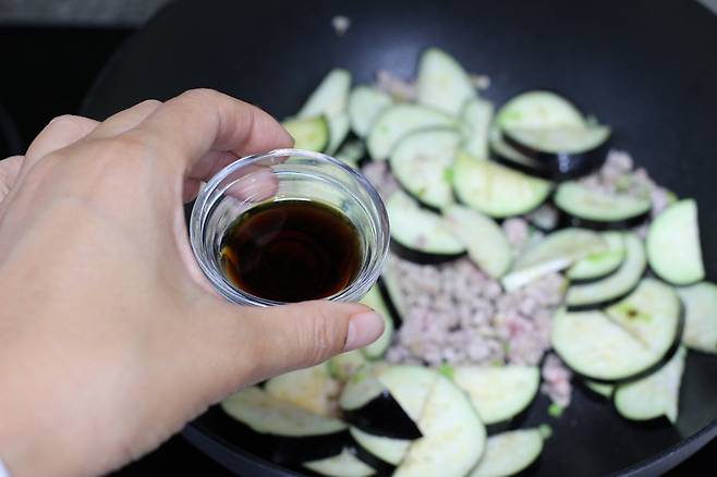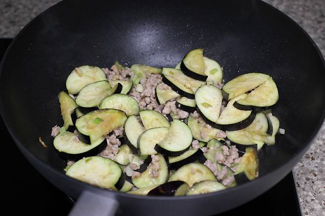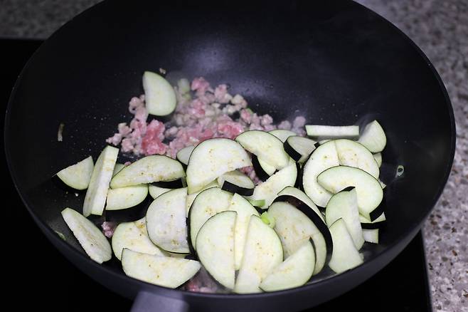 가지가 살짝 숨이 죽고 돼지고기의 핑크빛이 다 사라지면 불을 꺼요.