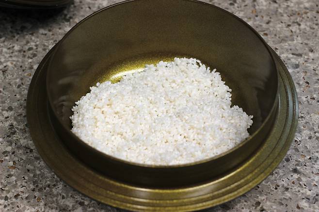 불리기 전 쌀의 양보다 살짝 적게 물을 넣어요. 원래 냄비밥을 할 때는 불리기 전 쌀의 양과 물 양을 동일하게 맞추면 되는데 가지밥은 가지에도 수분이 많기 때문에 물 양을 살짝 줄여주는 것이 좋답니다.