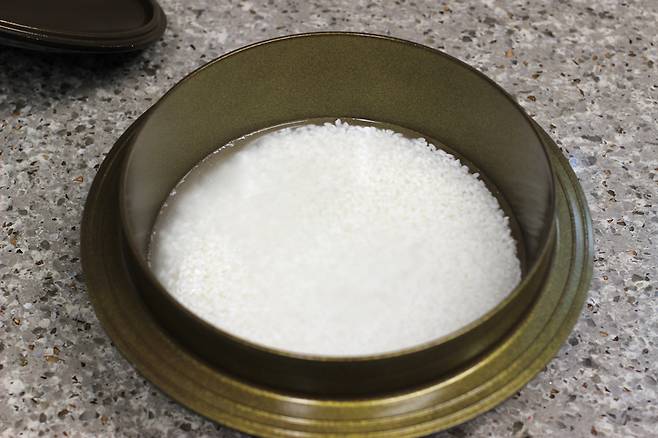 이제 본격적으로 밥을 할 차례에요. 불린 쌀은 물을 쫙 빼서 냄비에 담고요.