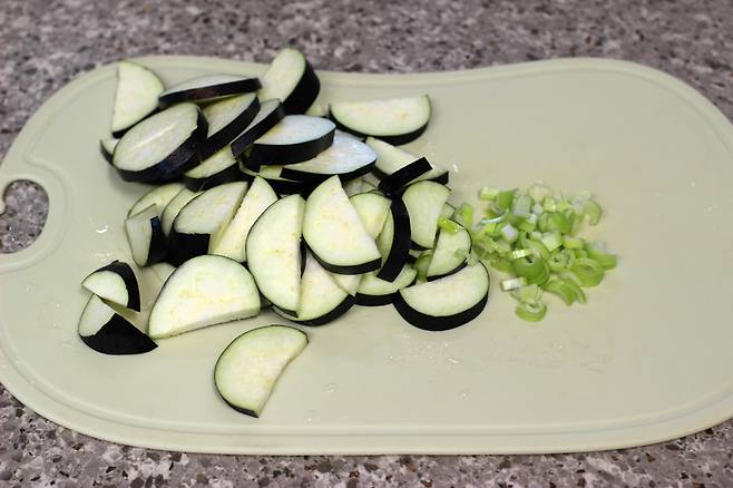 대파 조금, 가지 큰 것으로 1개 씻어 썰었어요. 대파는 총총 다지고 가지는 반달 모양으로 썰어요.