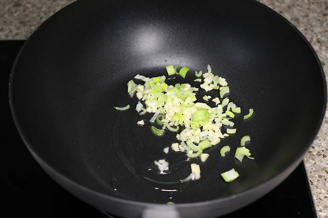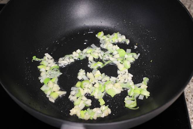 대파를 먼저 자글자글 볶아요. 기름에 볶아지면 대파의 달달한 향이 올라와요.