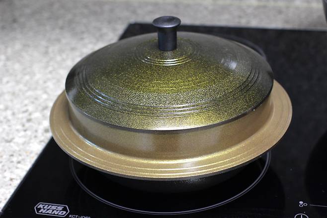 뚜껑을 닫고 밥을 지어요. 뚜껑을 닫고 중간불에서 17분, 불을 최대한 줄여서 5분, 그리고 뚜껑을 열지 않은 채로 5분정도 뜸을 들이면 됩니다.