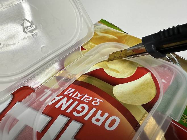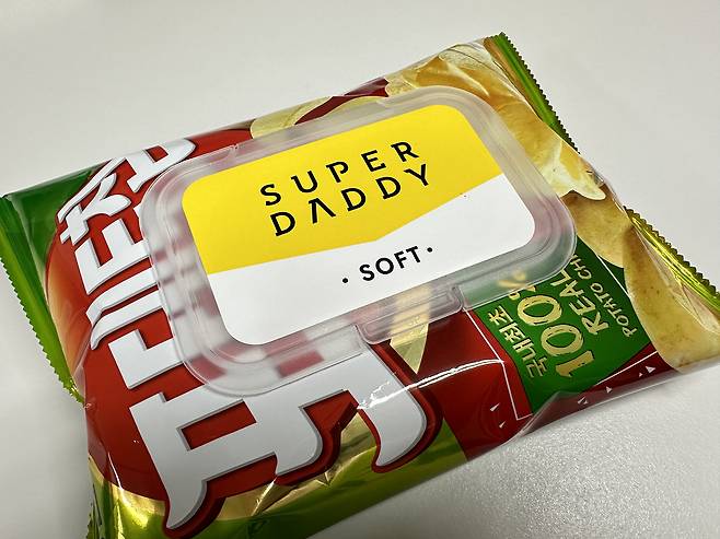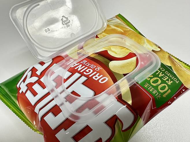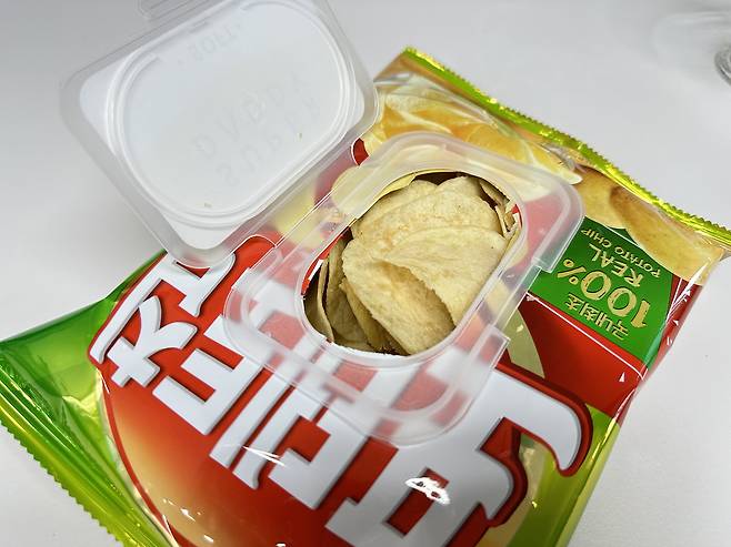 물티슈 뚜껑을 분리하여 과자봉지에 붙여주세요. 이렇게 하면 함께 먹기도 편하고 과자가 남을 경우에도 보관하기가 쉽습니다.