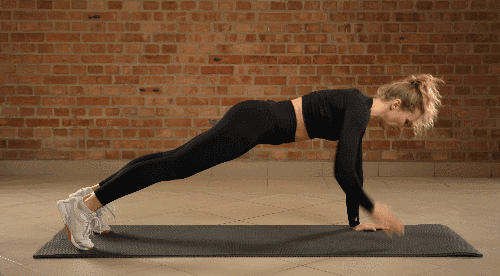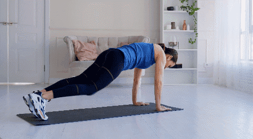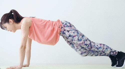 플랭크 자세로 바닥에 엎드립니다. 왼손을 들어 오른쪽 어깨를 가볍게 터치하고, 다시 원위치로 돌아갑니다. 그 후 오른손을 들어 왼쪽 어깨를 터치합니다.