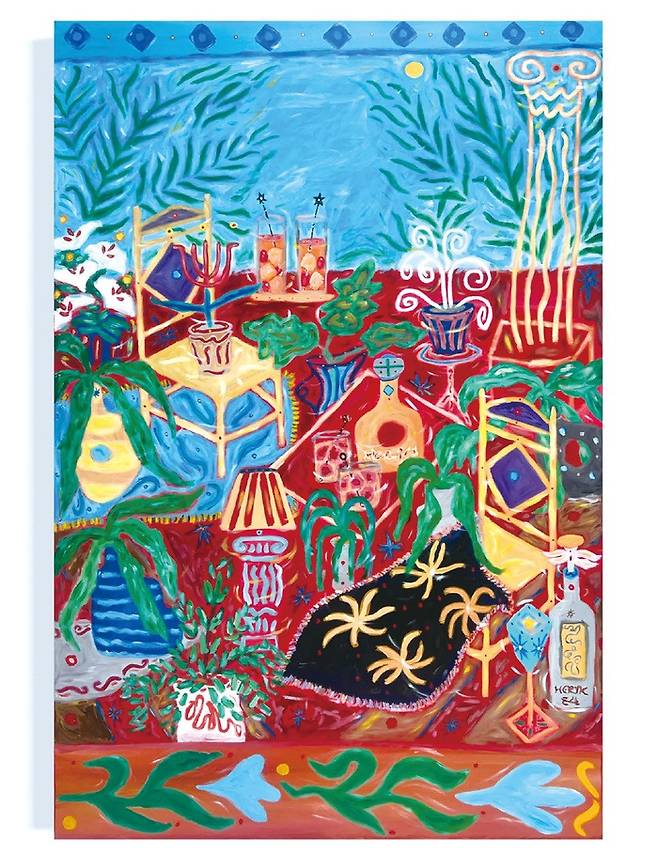“태양의 정원 Jardin of Solar”(2024)은 아크릴 물감으로 캔버스에 그려진 대형 작품(190×130.3㎝)으로, 작가의 예술 세계를 더욱 웅대하게 보여줍니다. 이 작품에서 “정원”은 단순한 식물들이 자라는 공간을 넘어, 태양의 에너지와 자연의 생명력이 어우러지는 신성한 공간으로 해석됩니다.