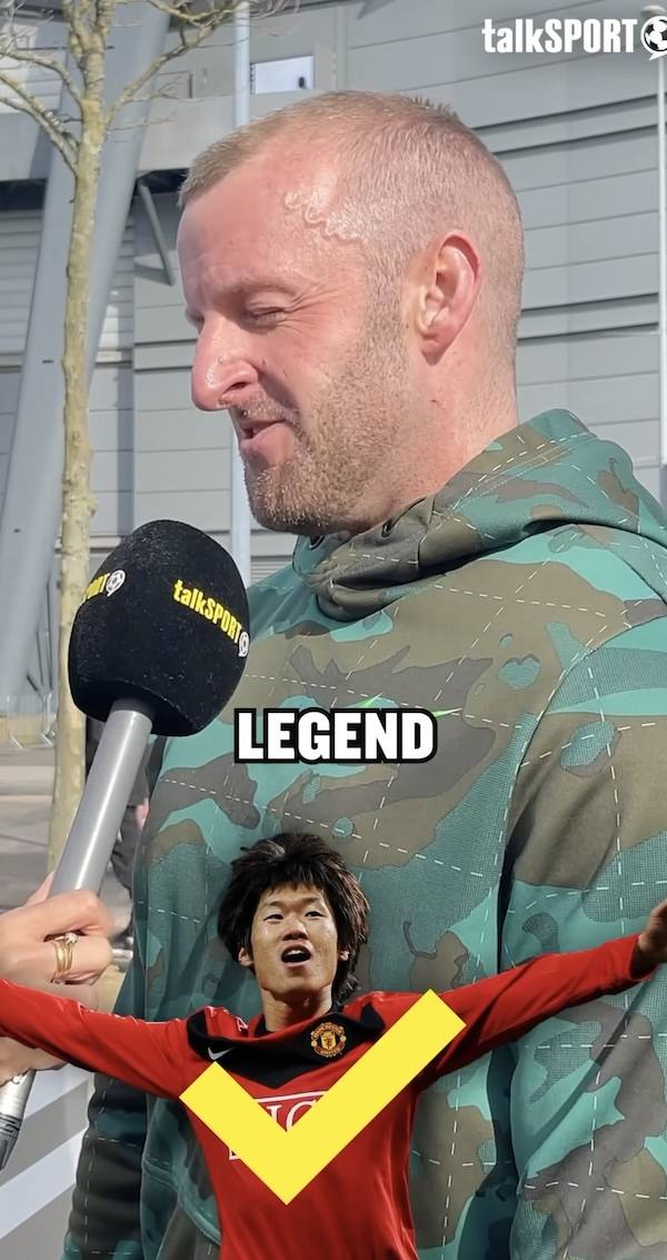 영국 매체 ‘토크 스포츠’는 5일(한국 시간) SNS를 통해 한 현지 팬과 인터뷰를 공개했다. 리포터는 팬에게 여러 선수를 거론하며 “이 선수가 맨유의 전설인가?”라고 물었다.
