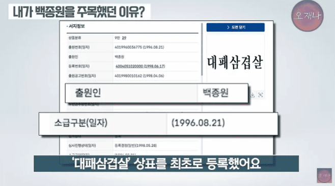 그는 영상에서 백 대표가 방송에서 밝힌 대패삼겹살 개발 주장은 사실이 아니라고 주장했습니다. 김 PD에 따르면 백 대표는 1996년 특허청에 대패삼겹살 상표권을 등록했을 뿐, 이를 최초로 개발한 인물은 아니라는 것입니다.